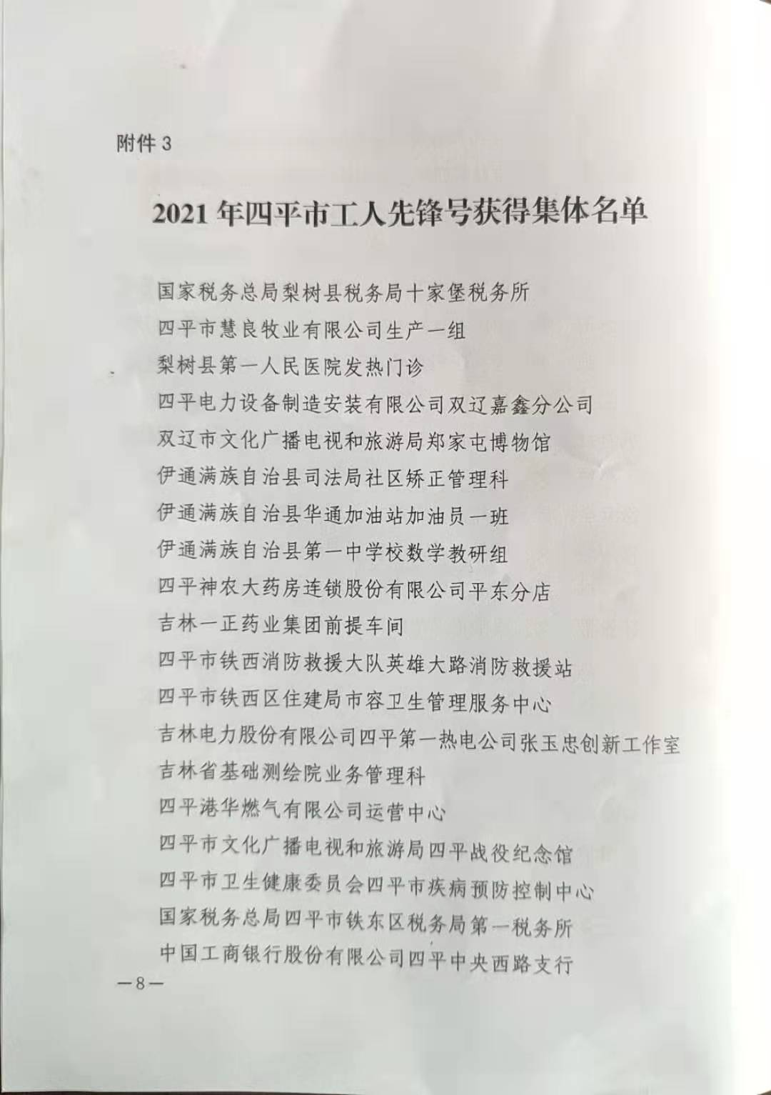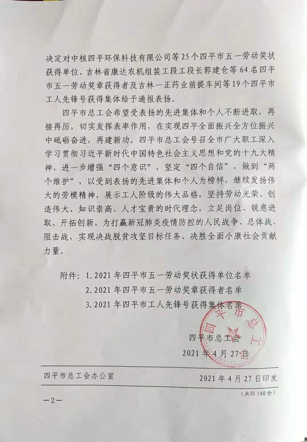 2021年4月27日,四平市總工會召開了慶祝“五一”國際勞動節大會,對2021年選樹的25個市“五一勞動獎狀”獲得單位、64名“五一勞動獎章”獲得者和19 個“工人先鋒號”獲得單位進行了表彰。我公司設備處檢修作業區焊鉗組組長劉軍同志被授予2021年四平市五一勞動獎章。