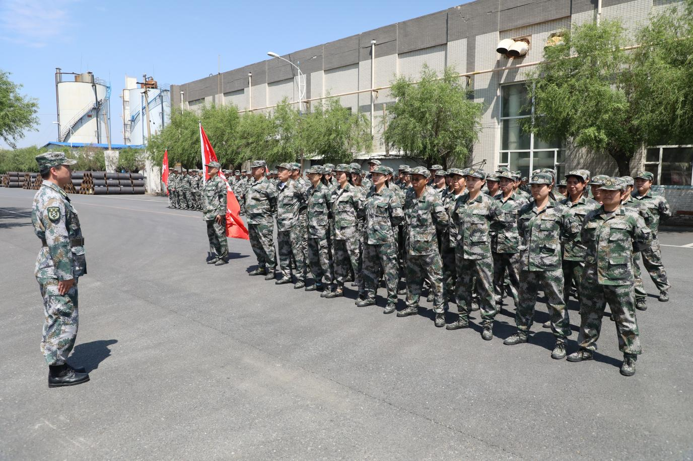 最后,帶隊教官田鳳鳴對軍訓做了點評,此次軍訓遇上了幾次大風、小雨,員工沒有退縮,依然頂著大風,冒著小雨堅持訓練,充分展現了金鋼員工的意志品質,達到了軍訓目的,取得了較好的成果,同時希望所有員工將良好的意志品質帶到工作中,為金鋼發展獻出一份力量,也祝愿金鋼蒸蒸日上,紅紅火火!